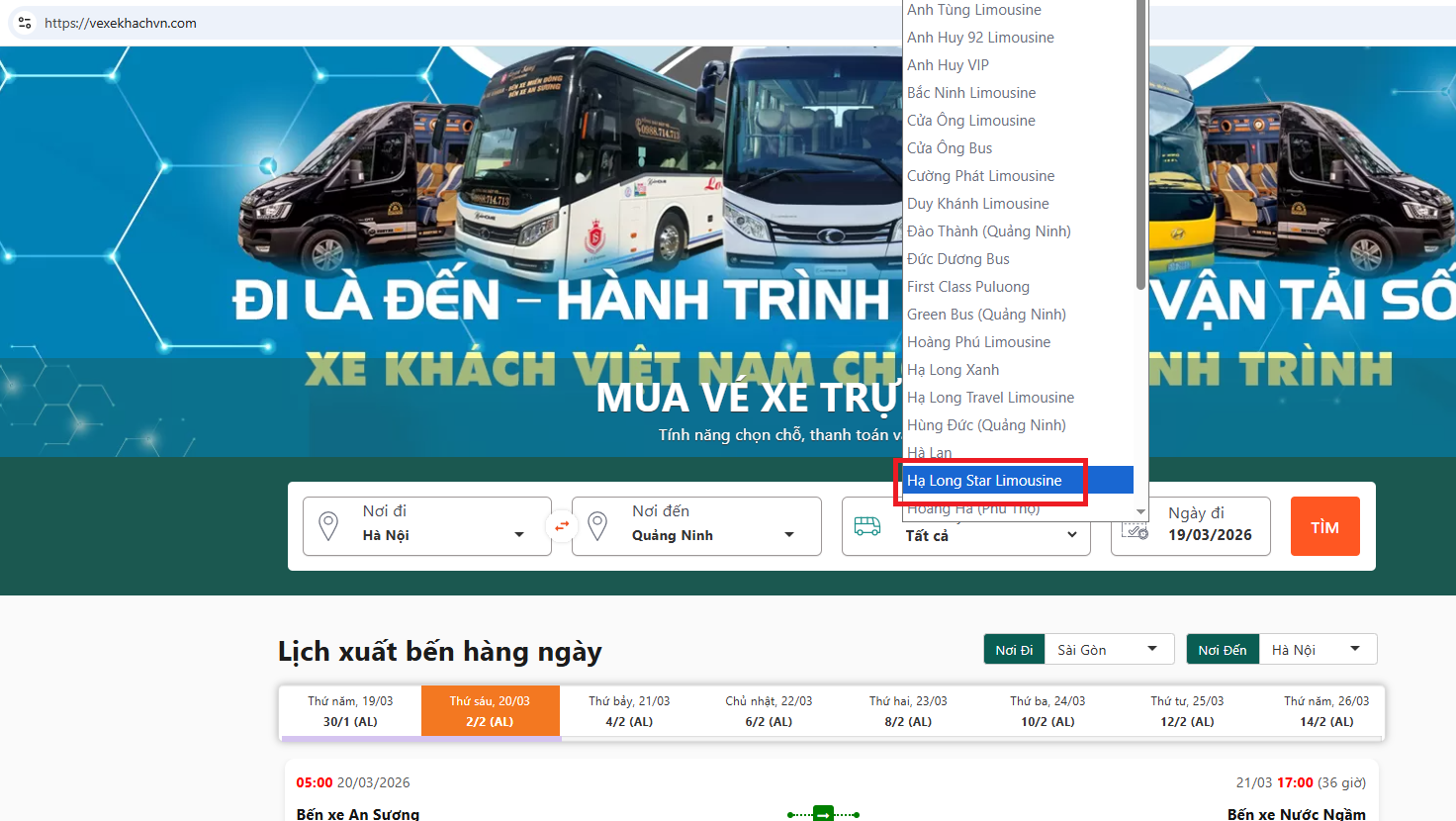 Nhấn nút "Tìm". Sau khi danh sách các chuyến xe hiện ra, bạn chọn "Hạ Long Star" để tiến hành đặt vé.