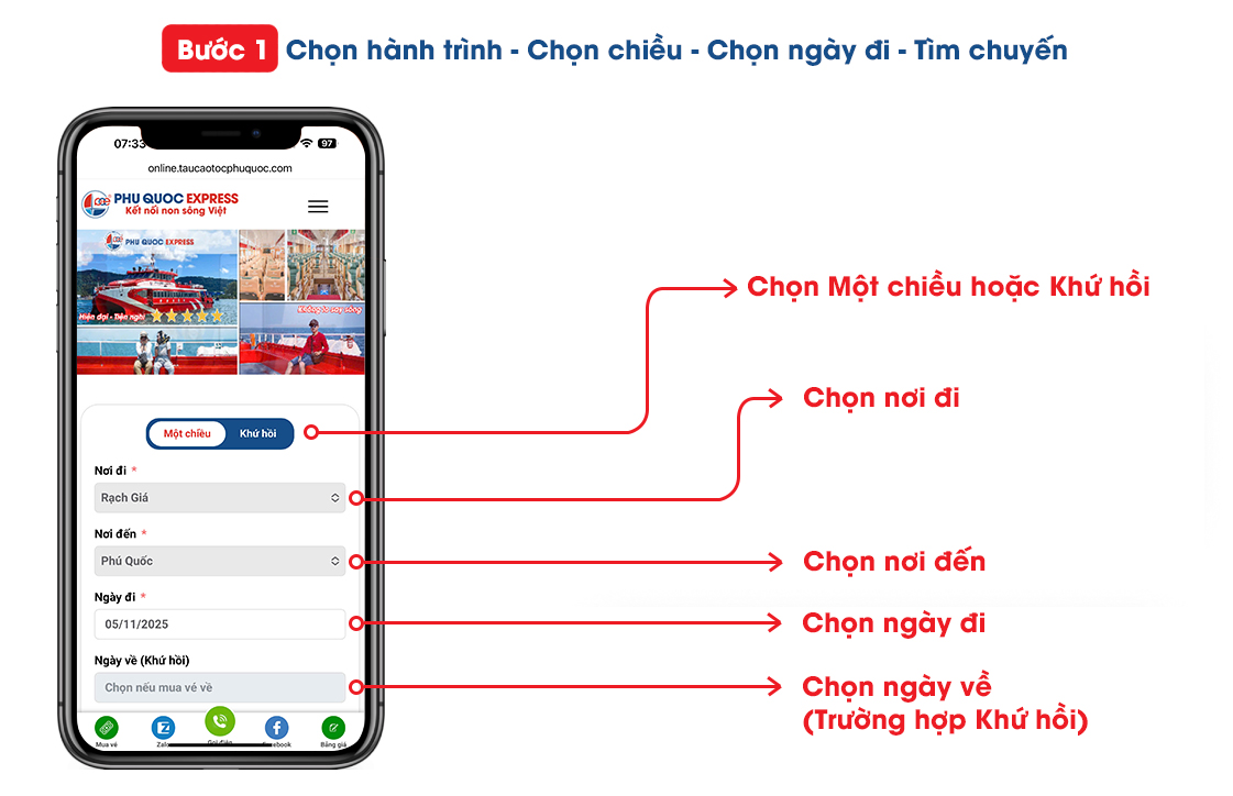 Dưới đây là các bước hướng dẫn đặt vé tàu cao tốc đi Phú Quốc - Rạch Giá/Hà Tiên (Phú Quốc Express):