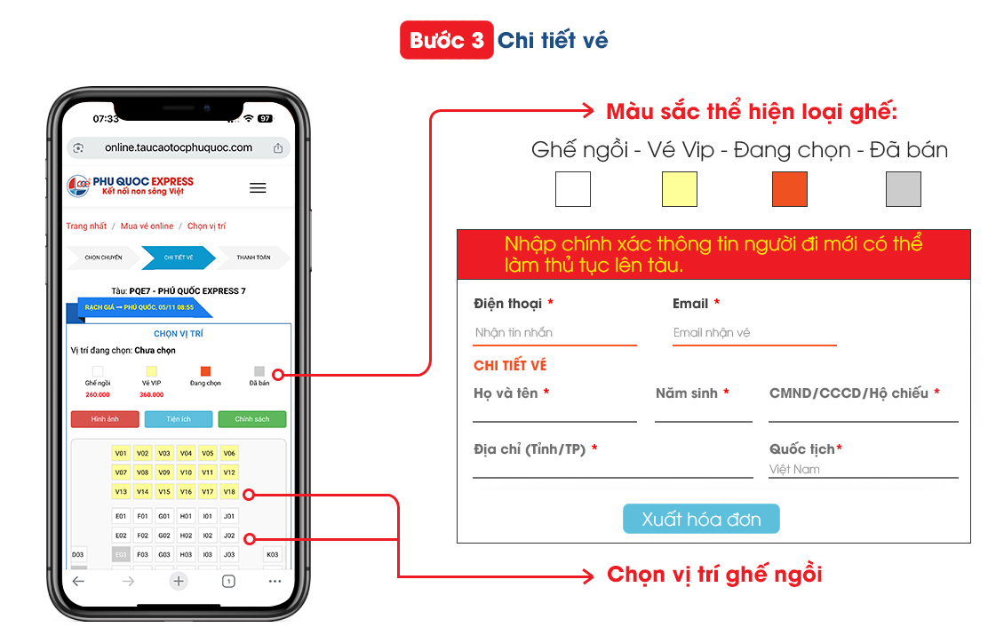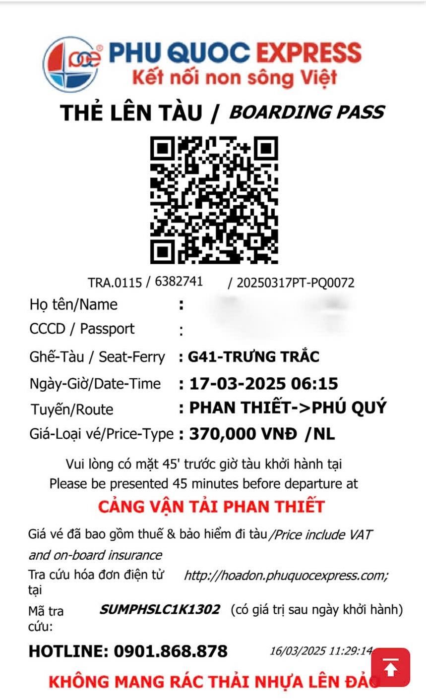 Đặt vé tàu Phú Quốc Express đi Phú Quốc từ Hà Tiên/Rạch Giá hành khách xem chi tiết thông tin vé gồm: