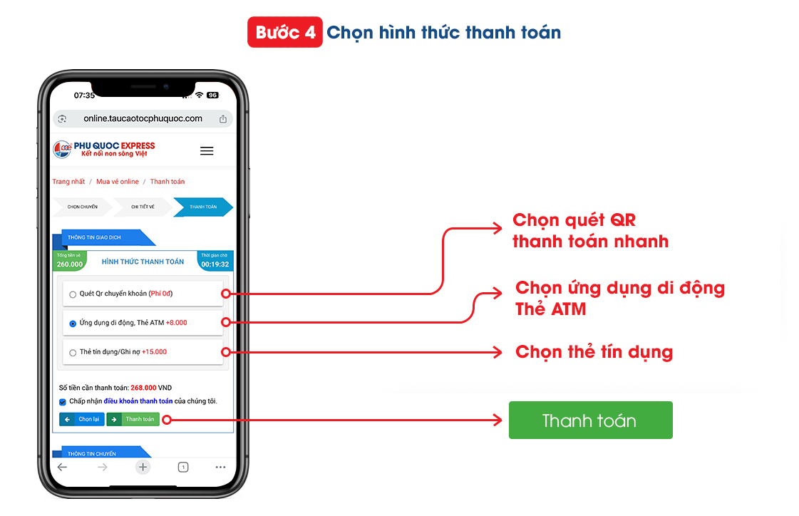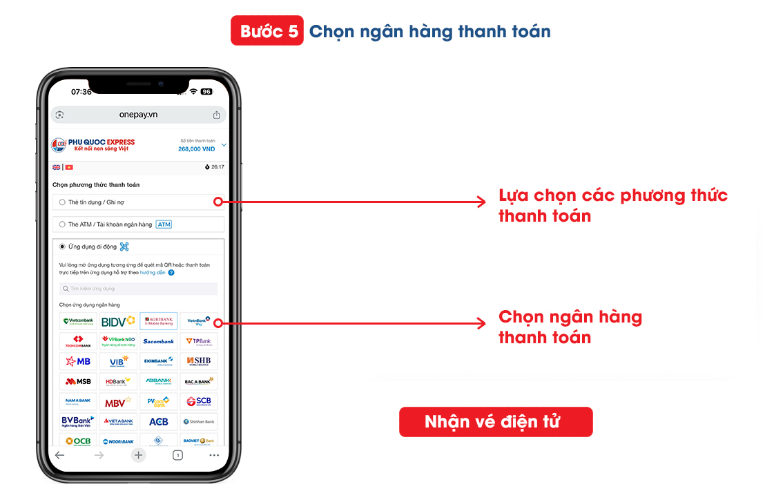 Bước cuối cùng hoàn thành cách đặt vé tàu cao tốc Phú Quốc online, hành khách chọn ngân hàng thanh toán và nhận vé điện tử được gửi qua email đã đăng ký.