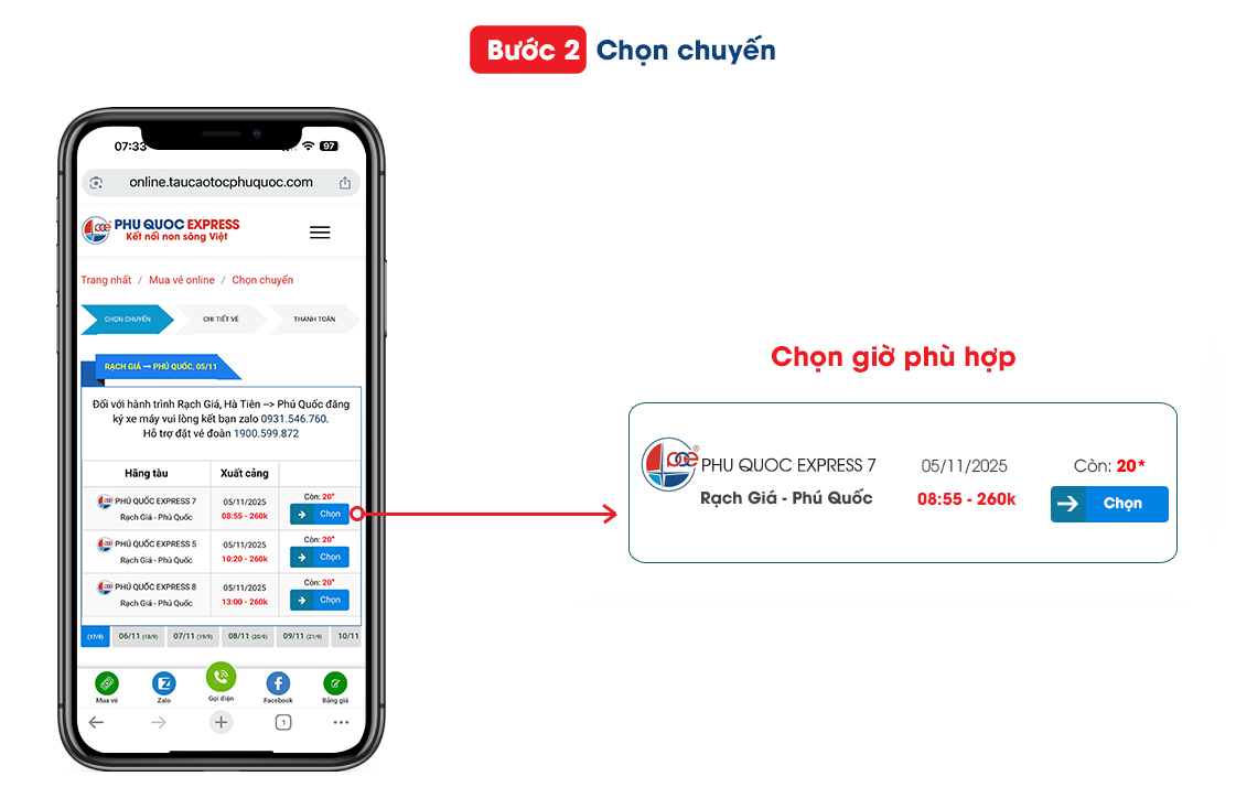 Bước tiếp theo của cách đặt vé tàu cao tốc Phú Quốc, hành khách lựa chọn tàu cao tốc yêu thích (Phú Quốc Express) và giờ khởi hành phù hợp với nhu cầu di chuyển bằng cách click “chọn” như trong hình ảnh.