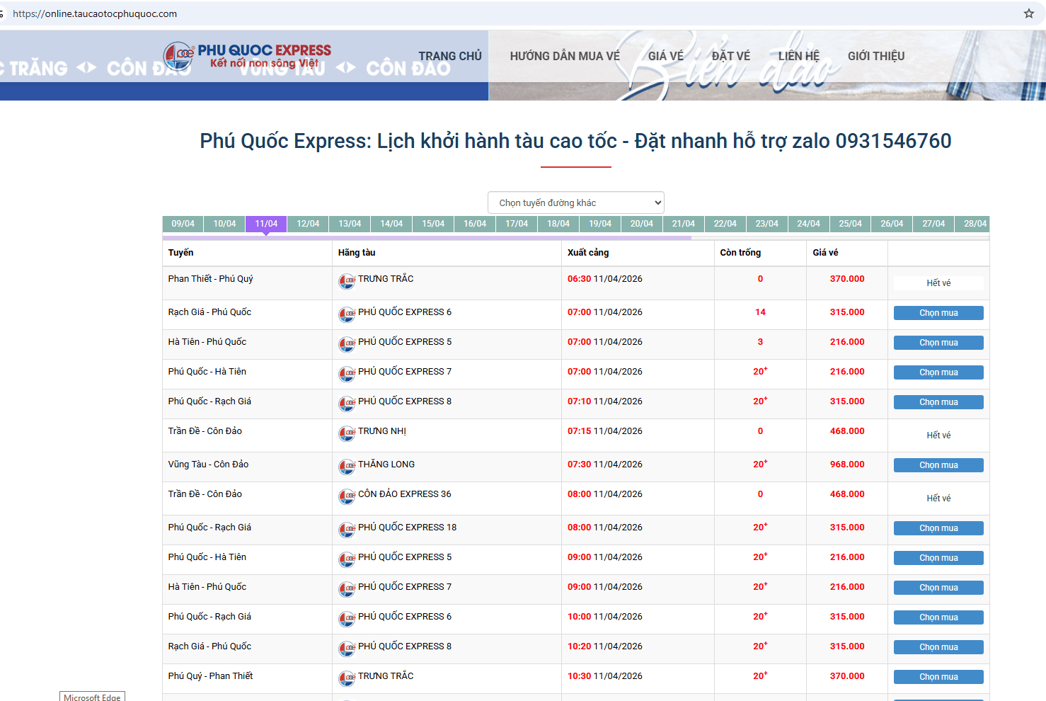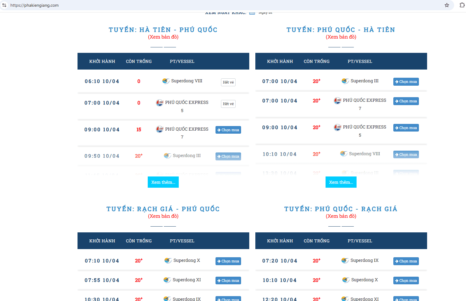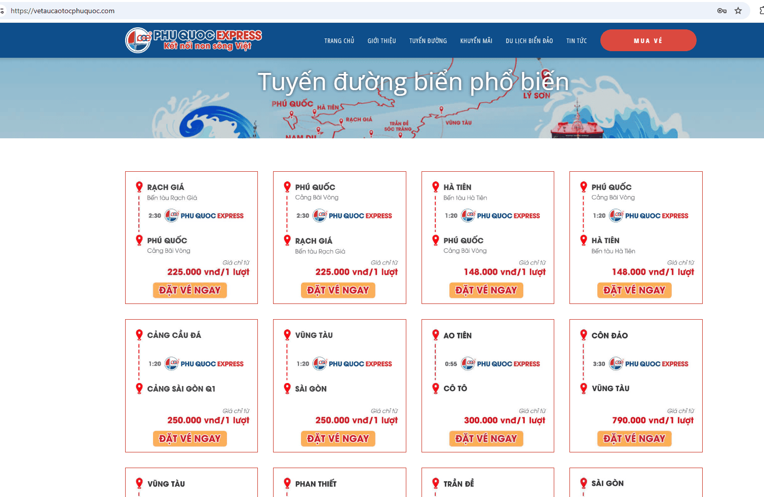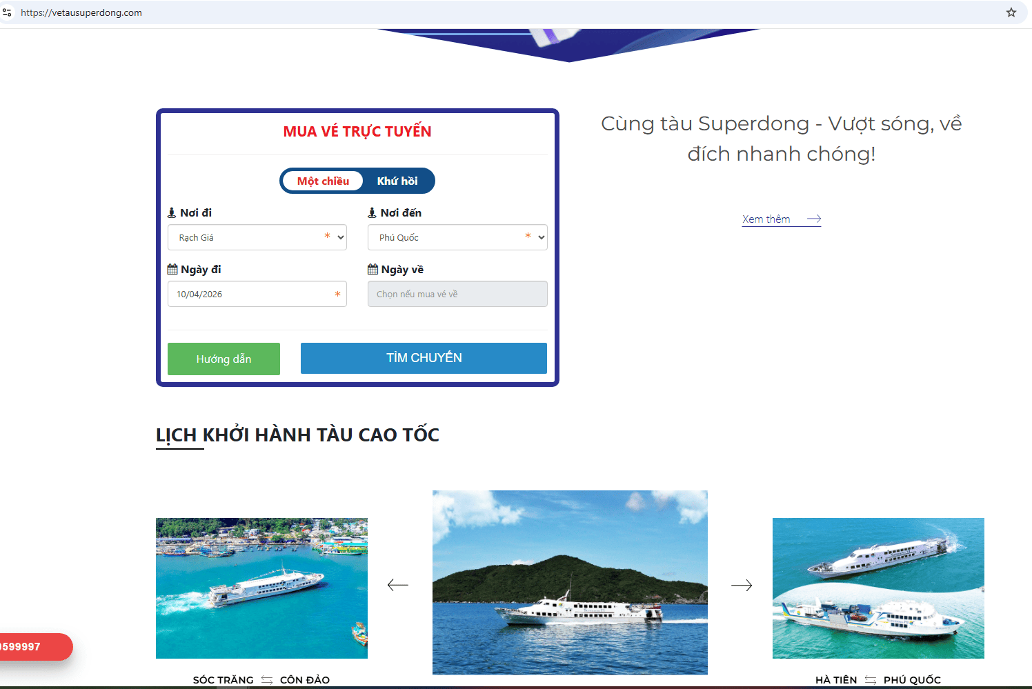 Đây là trang web đặt vé tàu chuyên trang của hãng Superdong, hãng tàu cao tốc 1 thân truyền thống quen thuộc với nhiều hành khách khi đi Phú Quốc. Trang web cung cấp đặt vé trực tuyến với giao diện thân thiện với người dùng và dễ dàng tra cứu các tuyến tàu cao tốc Phú Quốc.