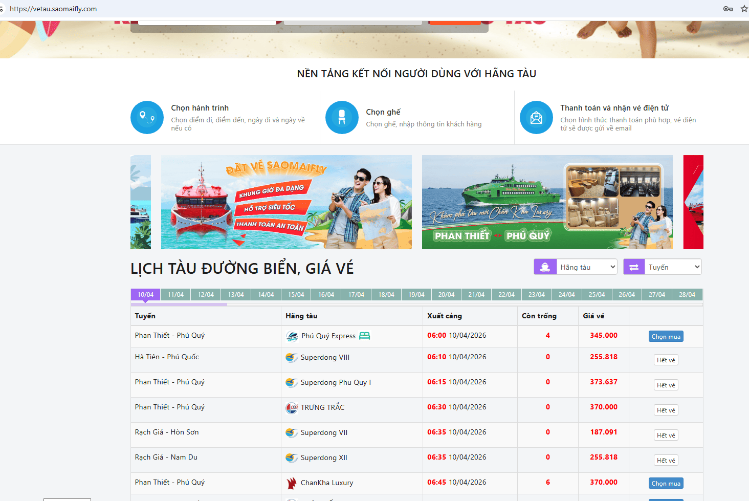Saomaifly là nền tảng đặt vé trực tuyến kết nối các hãng tàu và hành khách qua giao diện mua vé thông minh. Bạn sẽ dễ dàng đặt vé tra cứu tuyến tàu, so sánh giá vé giữa các hãng tàu đi Phú Quốc, lịch chọn lịch tàu và mua vé nhanh chóng.