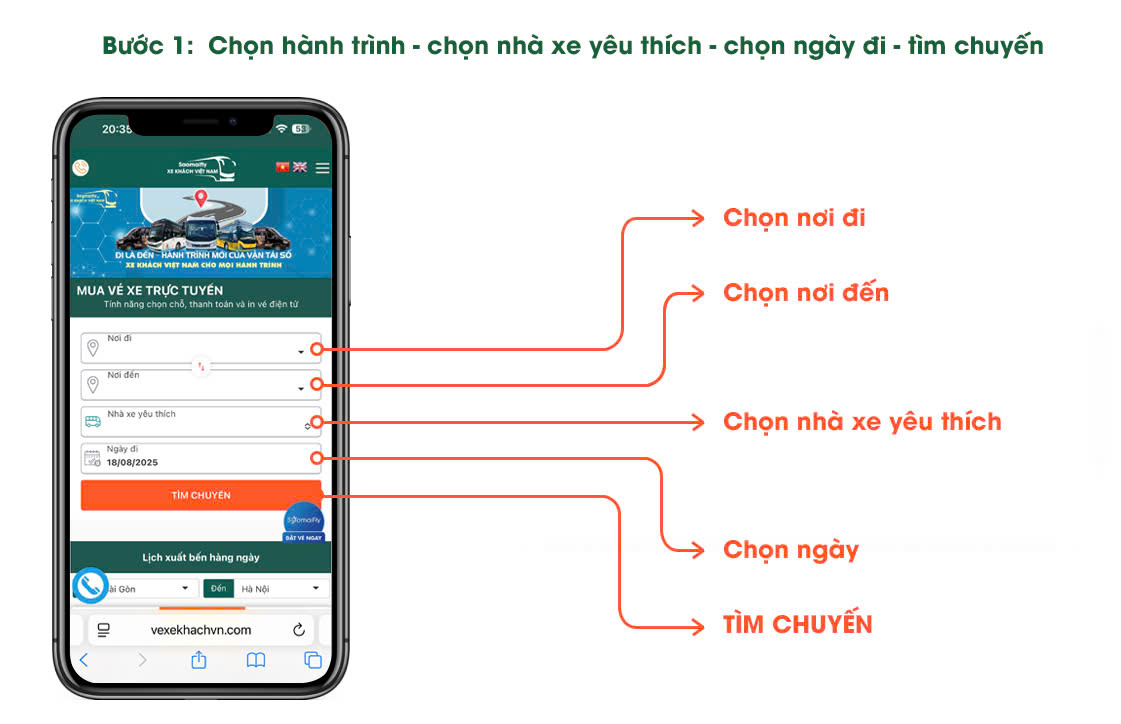Bước 1: Chọn hành trình - chọn nhà xe yêu thích - chọn ngày đi - tìm chuyến