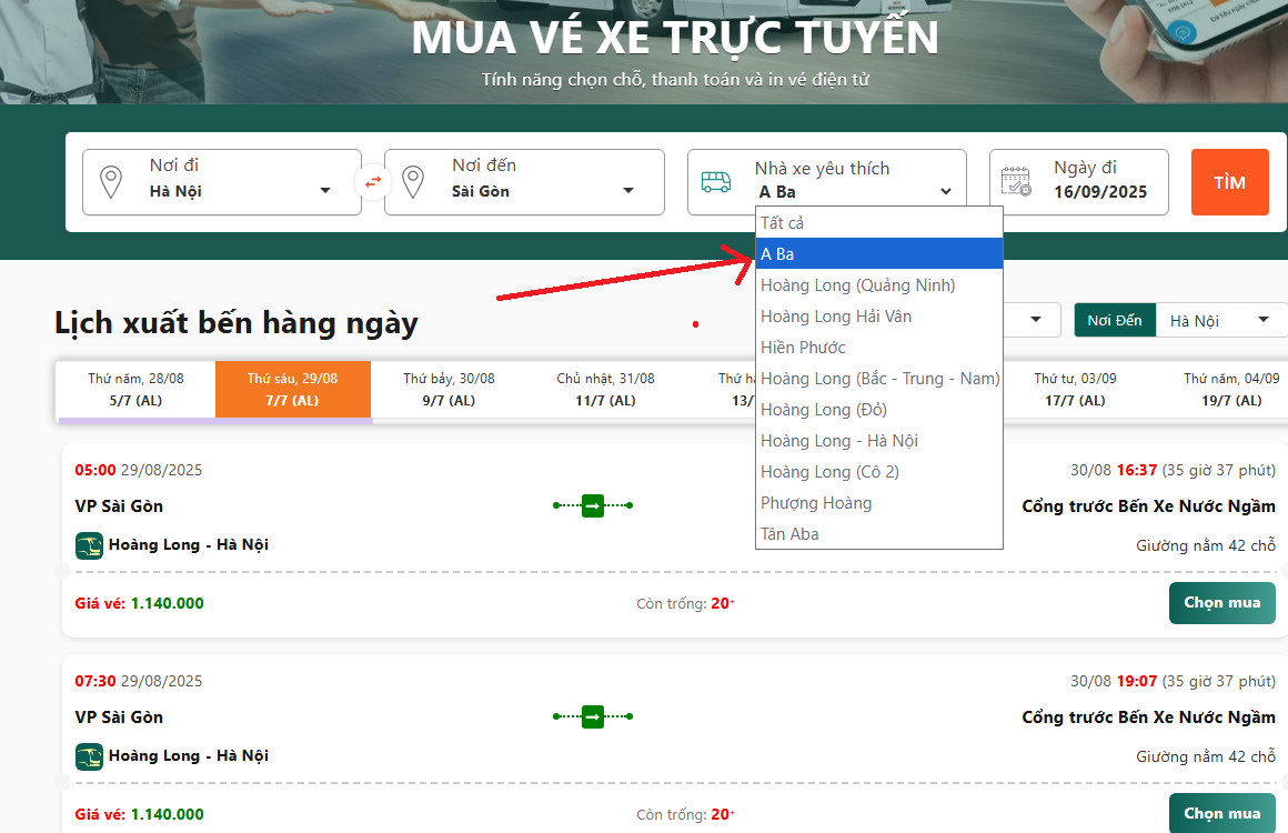 Đặt xe khách liên tỉnh đi tại: vexekhachvn.com và chọn: Nơi đi (Hà Nội) → nơi đến (Sài Gòn) → lọc nhà xe A Ba theo hướng dẫn từ ảnh bên dưới.