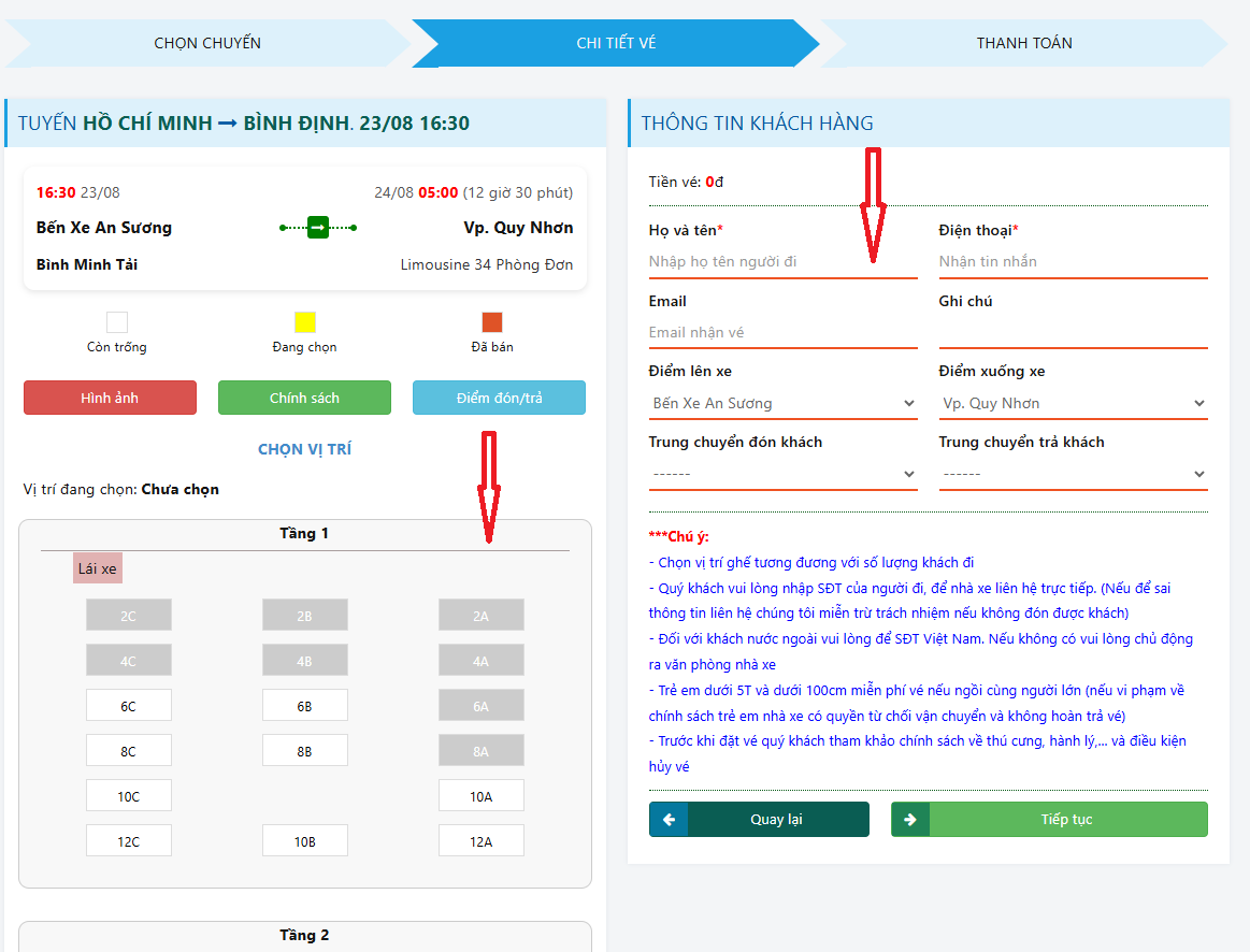 Bước 2: Chọn ghế, điểm đón và trả khách, đồng thời điền đầy đủ và chính xác thông tin hành khách.