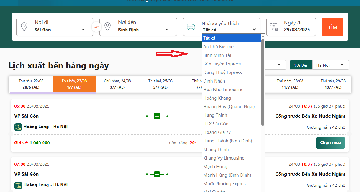Bước 1: Đặt vé xe tại: https://vexekhachvn.com/xe-binh-minh-tai/ và lựa chọn thời gian phù hợp với nhu cầu di chuyển.