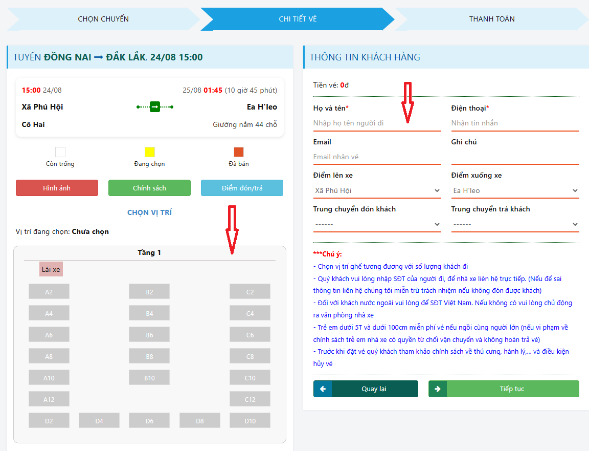 Chọn ghế trên sơ đồ hiển thị (các ghế màu trắng là ghế trống). Tiếp theo, điền đầy đủ thông tin hành khách và xác định chính xác điểm lên xe, điểm xuống xe cũng như các dịch vụ trung chuyển nếu có.