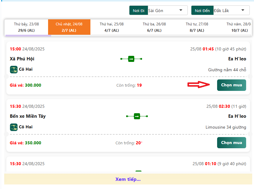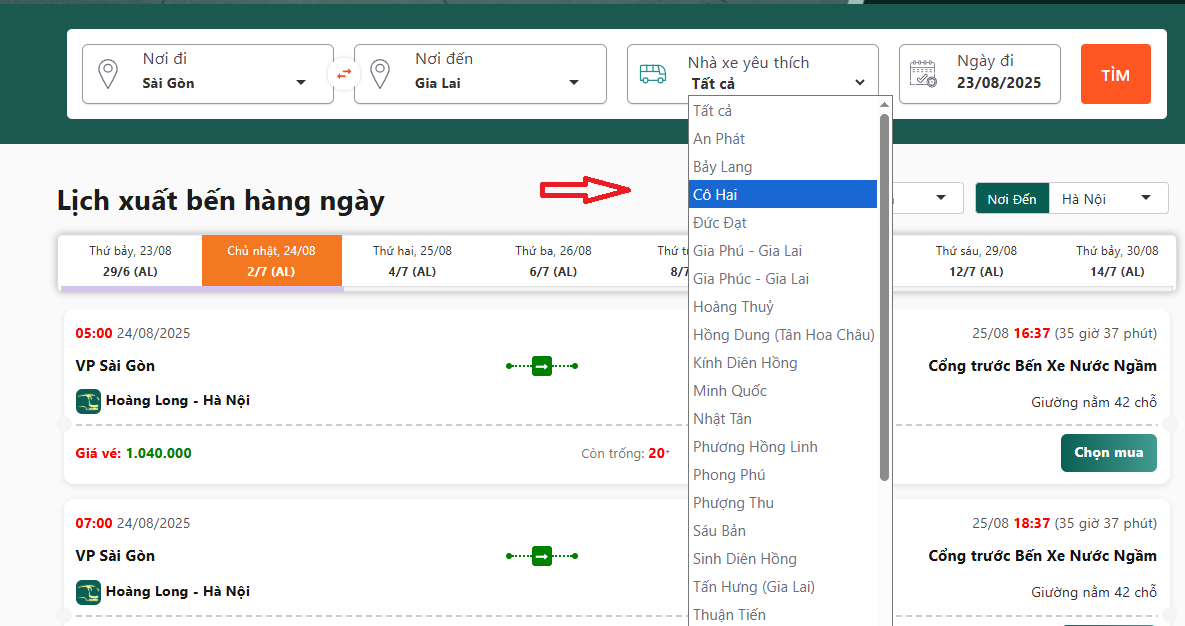 Bước 1: Đặt vé xe khách Cô Hai đi Gia Lai tại: https://vexekhachvn.com/xe-co-hai/ lựa chọn thời gian di chuyển/điểm đón/trả khách và click “chọn mua”.