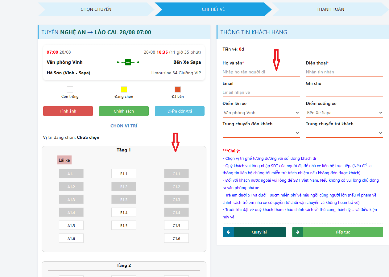 Theo sơ đồ chỗ ngồi hiển thị trên hệ thống, hãy chọn vị trí ghế mong muốn. Tiếp theo, nhập đầy đủ thông tin hành khách gồm: họ và tên, số điện thoại liên hệ, email, điểm đón - điểm trả, cùng điểm trung chuyển (nếu có). Sau khi hoàn tất, nhấn ‘Tiếp tục’ để chuyển sang bước tiếp theo.