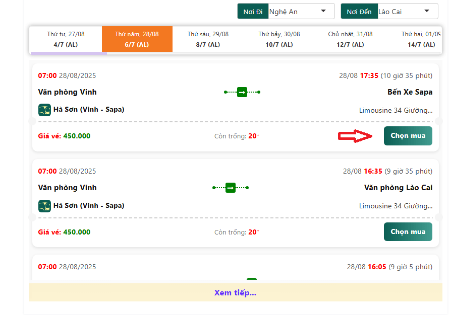 Xem danh sách các chuyến xe và lựa chọn chuyến phù hợp với nhu cầu di chuyển của bạn. Hãy cân nhắc các tiêu chí quan trọng như: giờ khởi hành - giờ đến dự kiến, điểm đón - điểm trả khách thuận tiện. Sau khi tìm được chuyến xe ưng ý, nhấn vào nút ‘Chọn’ để tiếp tục.