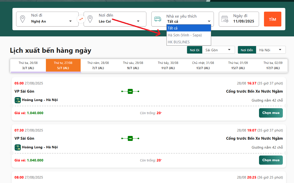 Đặt xe khách liên tỉnh đi Lào Cai tại: vexekhachvn.com và chọn: Nơi đi (Nghệ An) → nơi đến (Lào Cai) → lọc nhà xe Futa Hà Sơn theo hướng dẫn từ ảnh bên dưới.