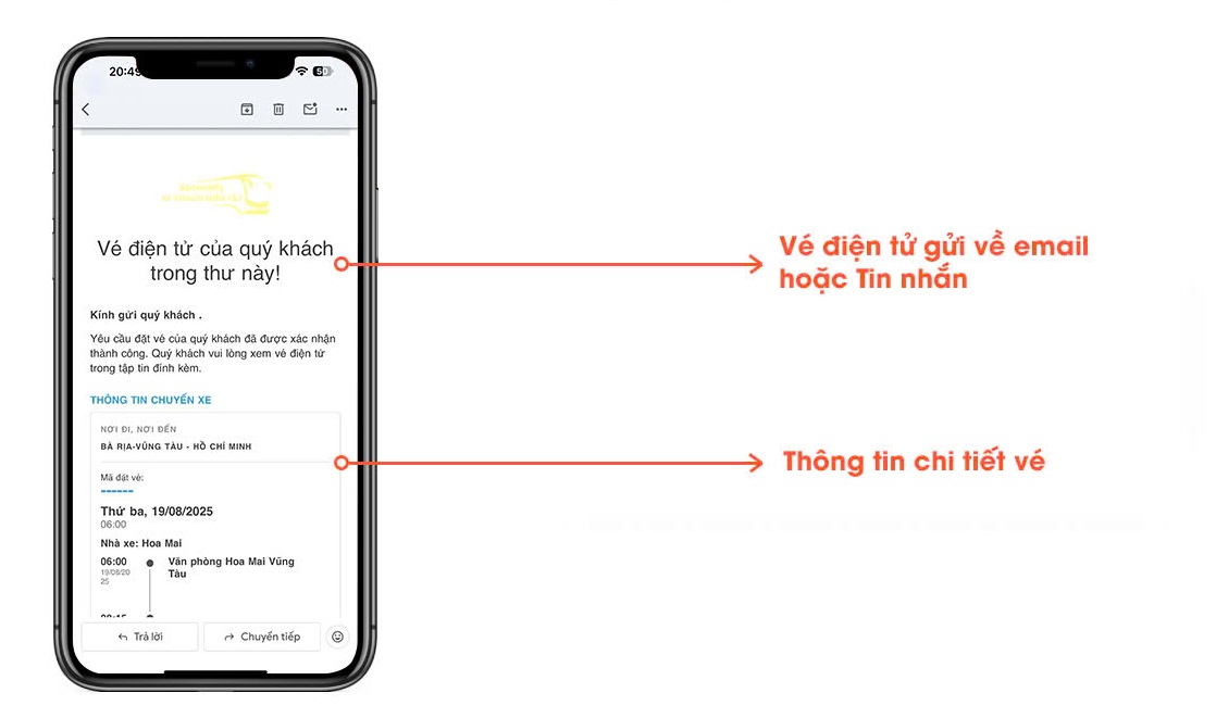 Thanh toán thành công vé điện tử sẽ được gửi đến email hoặc SMS của hành khách. Vui lòng kiểm tra kỹ thông tin chuyến đi, bao gồm giờ khởi hành, điểm đón/trả và số ghế, để đảm bảo chính xác trước khi lên xe.