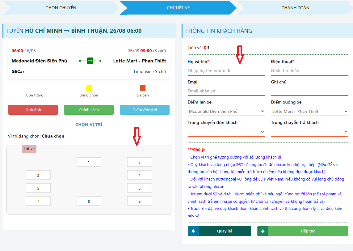 Bước 3: Chọn ghế - điền thông tin - chọn điểm đón trung chuyển - điểm đến