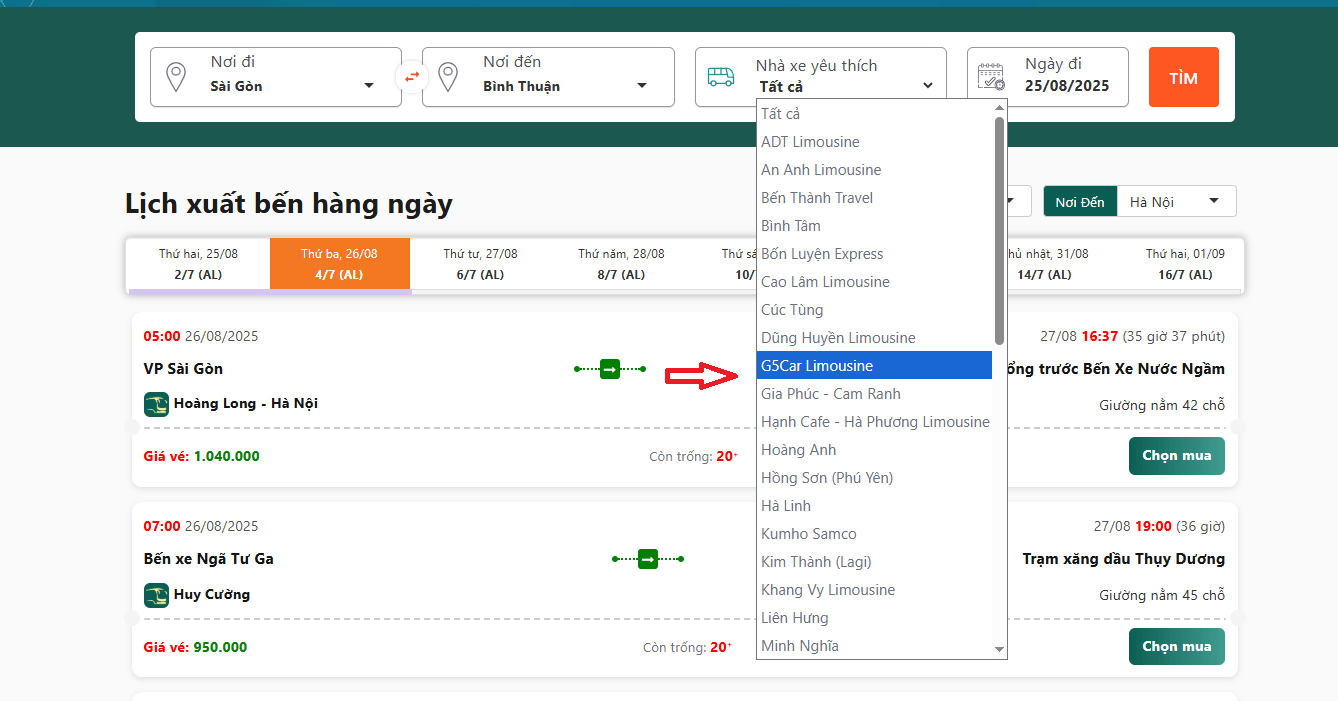 Bước 1: Đặt vé xe khách G5Car Limousine đi Bình Thuận tại: https://vexekhachvn.com/xe-g5car-limousine/ chọn chuyến đi có thời gian khởi hành và điểm đón/trả phù hợp.