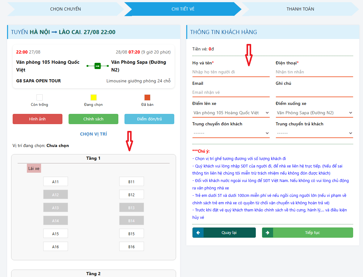 Chọn vị trí ghế ngồi trên sơ đồ ghế của nhà. Sau đó điền đầy đủ thông tin hành khách, bao gồm: họ tên, số điện thoại, email, điểm đón - điểm trả, và điểm trung chuyển (nếu có). Sau đó click ‘Tiếp tục’ để thực hiện các bước đặt vé tiếp theo.