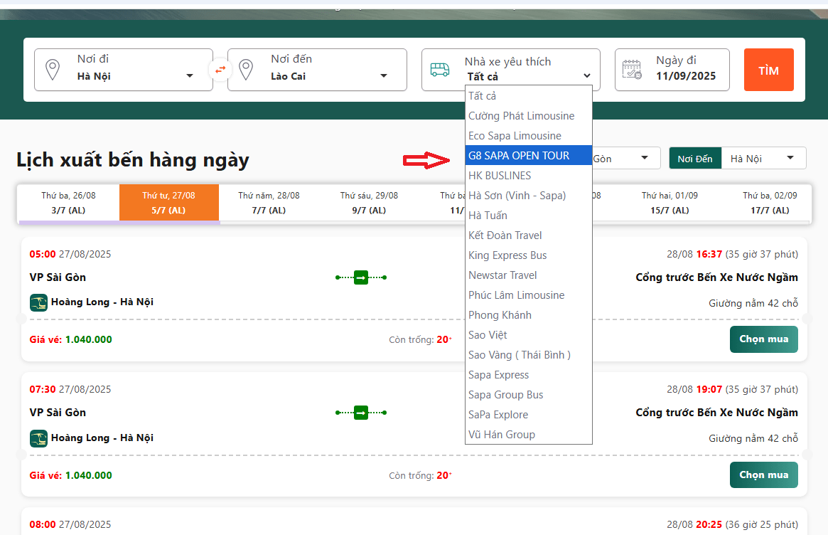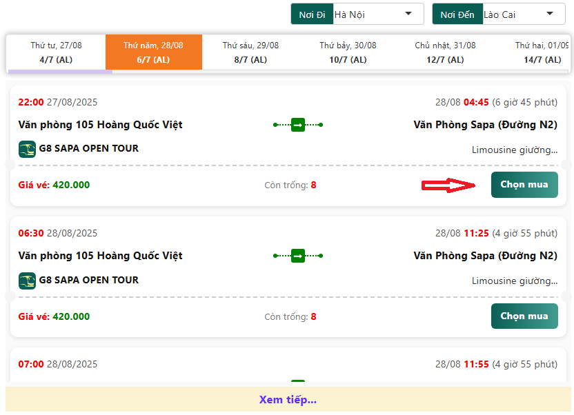 Bước 1: Đặt vé xe khách 8 Sapa Open Tour đi Lào Cai tại: https://vexekhachvn.com/xe-g8-sapa-open-tour/ chọn chuyến đi có thời gian khởi hành và điểm đón/trả phù hợp click “chọn mua”.