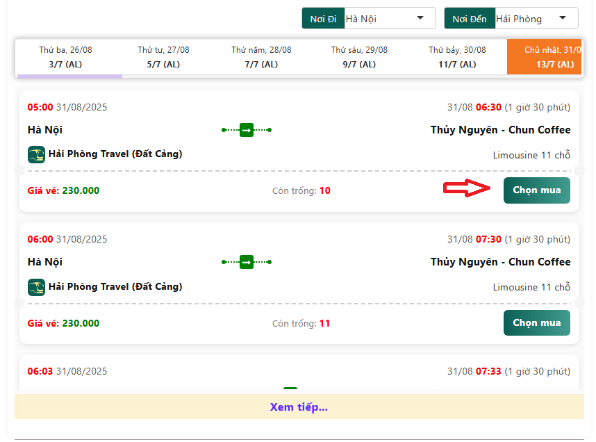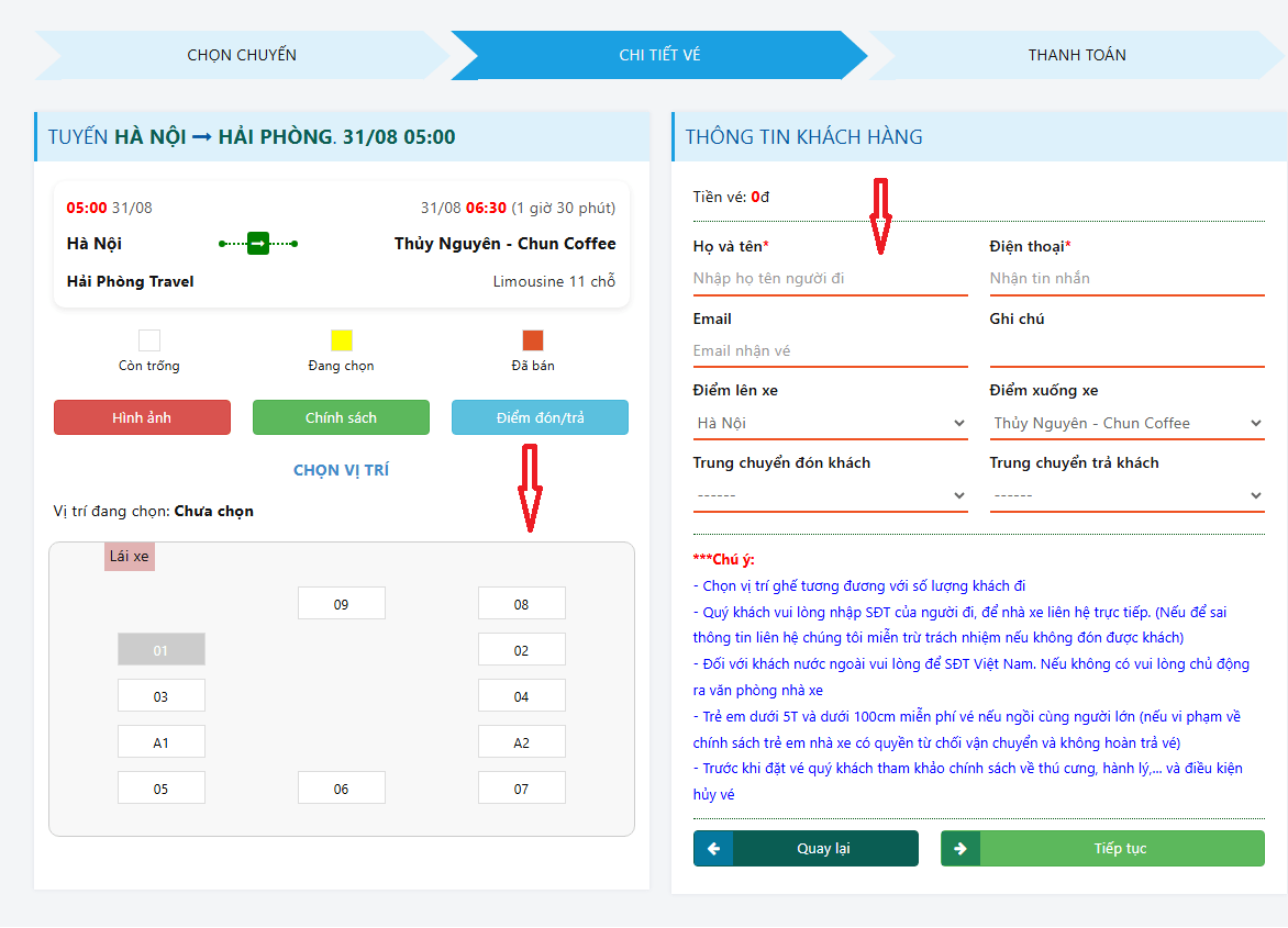 Kiểm tra thông tin giờ xuất phát và địa điểm đón/trả phù hợp, sau đó nhấn “Chọn mua”. Tiếp theo, chọn ghế còn trống trên sơ đồ và điền đầy đủ thông tin cá nhân để hoàn tất việc đặt vé xe khách đi Hải Phòng.