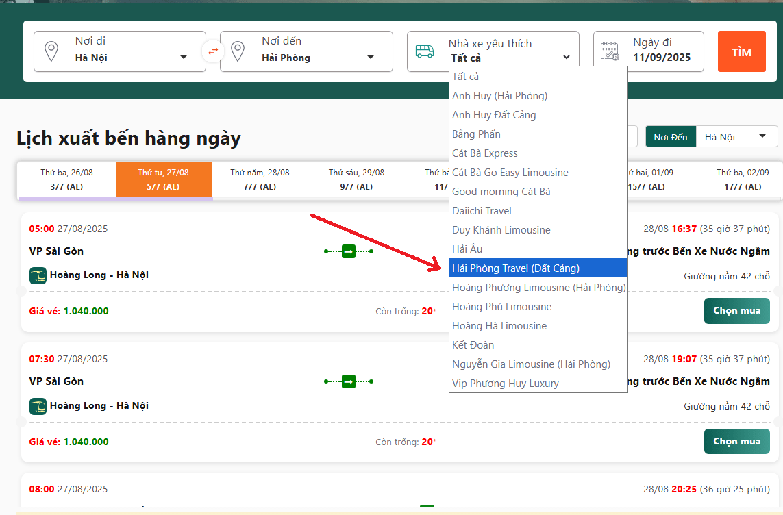 Đặt xe khách liên tỉnh đi Hải Phòng tại: vexekhachvn.com và chọn: Nơi đi (Hà Nội) → nơi đến (Hải Phòng) → lọc nhà xe Hải Phòng Travel theo hướng dẫn từ ảnh bên dưới.