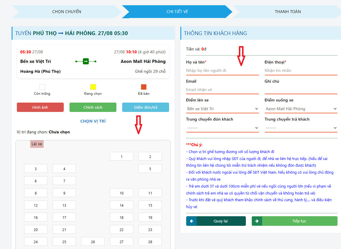 Dựa vào sơ đồ chỗ ngồi và lựa chọn vị trí mong muốn. Ghế màu xám đã có người đặt, ghế màu trắng là còn vé. Sau khi chọn ghế, điền đầy đủ thông tin cá nhân để nhận vé điện tử, sau đó nhấn “Tiếp tục” để mua vé xe rẻ đi Hải Phòng.