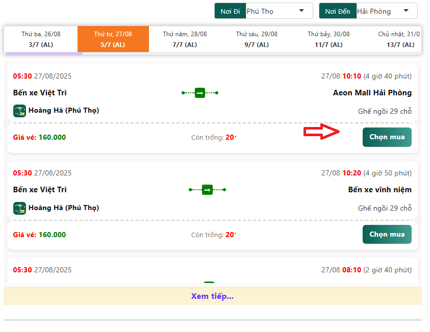 Cân nhắc về thời gian khởi hành và điểm đón/trả để đảm bảo phù hợp lịch trình, sau đó nhấn “Chọn mua”. Tiếp theo, chọn ghế trống trên sơ đồ và cung cấp đầy đủ thông tin cá nhân để hoàn tất đặt vé xe đi Hải Phòng.