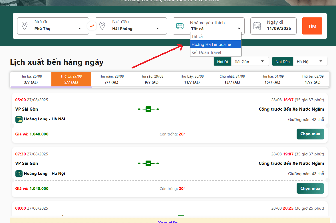 Bước 1: Đặt vé xe khách Hoàng Hà Limousine đi Hải Phòng tại: https://vexekhachvn.com/xe-hoang-ha-limousine/ chọn chuyến đi có thời gian khởi hành và điểm đón/trả phù hợp click “chọn mua”.