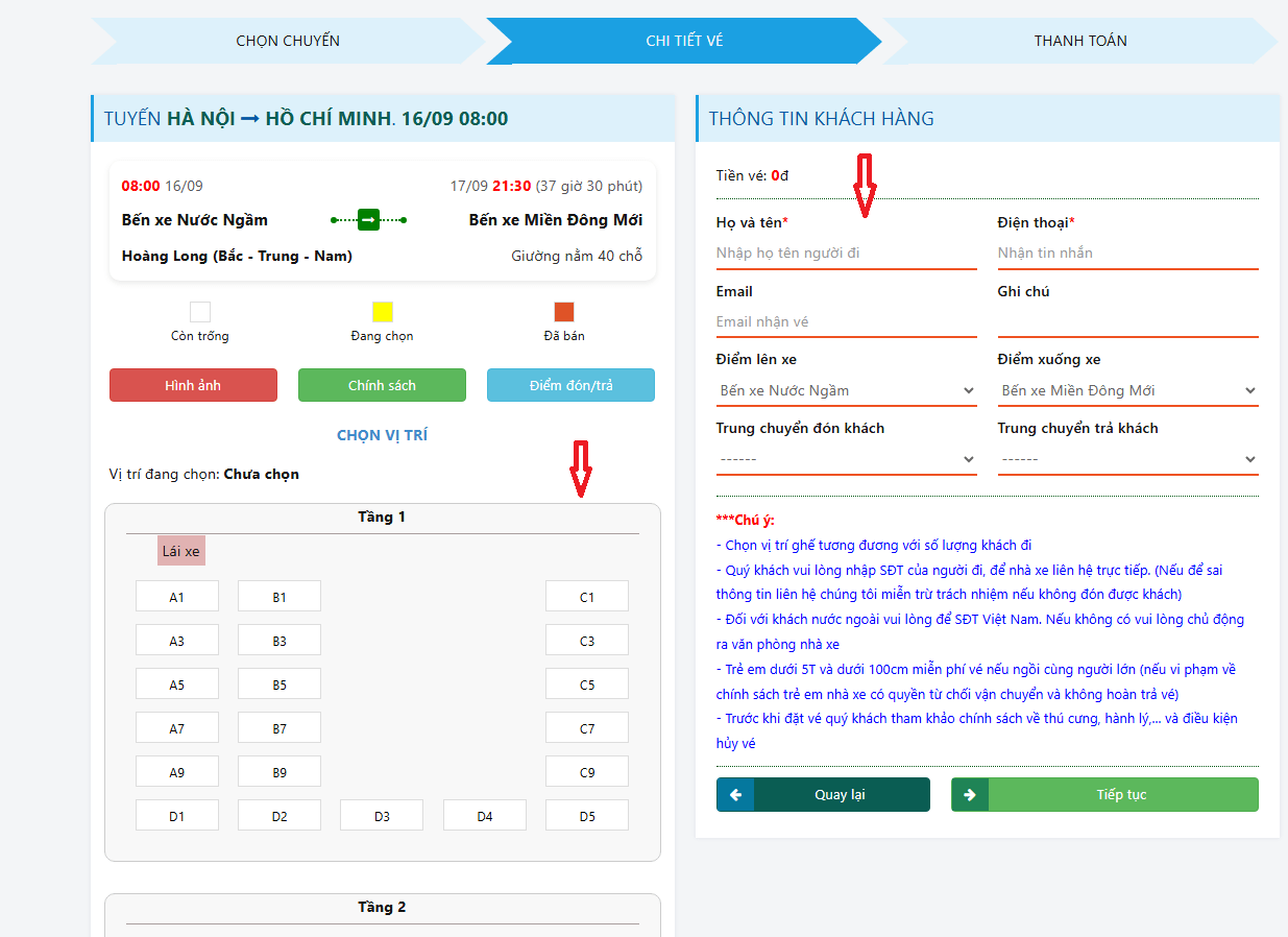 Bước 3: Chọn ghế - điền thông tin - chọn điểm đón trung chuyển - điểm đến