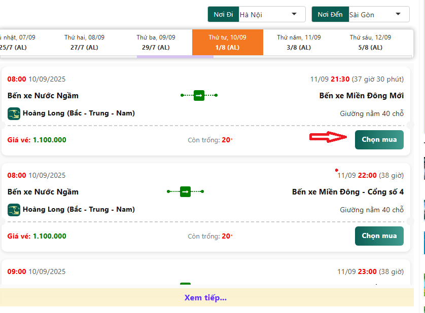 Bước 1: Đặt vé xe khách Hoàng Long (Bắc - Trung - Nam) đi Sài Gòn tại: https://vexekhachvn.com/xe-hoang-long-bac-trung-nam/ chọn chuyến đi và nhấn “chọn mua”.