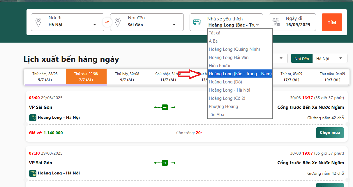 Đặt xe khách liên tỉnh đi tại: vexekhachvn.com và chọn: Nơi đi (Hà Nội) → nơi đến (Sài Gòn) → lọc nhà xe Hoàng Long (Bắc - Trung - Nam) theo hướng dẫn từ ảnh bên dưới.