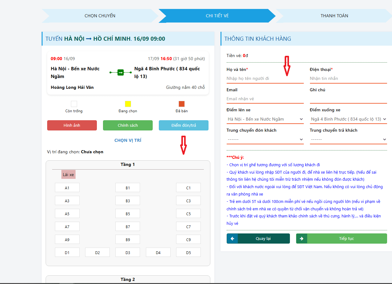 Bước 3: Chọn ghế - điền thông tin - chọn điểm đón trung chuyển - điểm đến