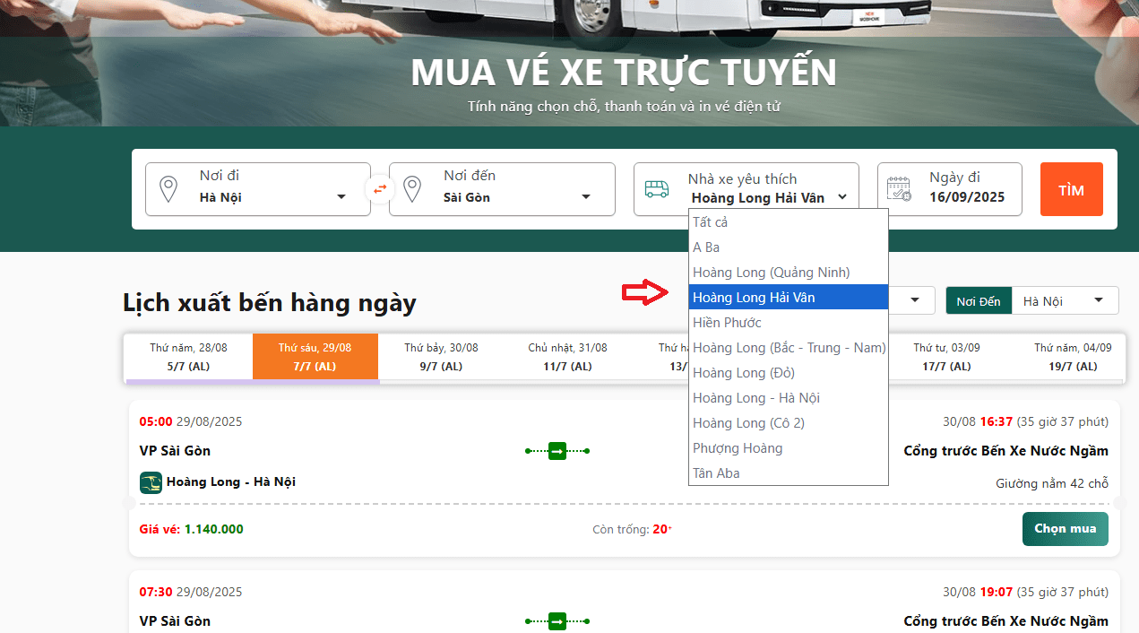 Đặt xe khách liên tỉnh đi tại: vexekhachvn.com và chọn: Nơi đi (Hà Nội) → nơi đến (Sài Gòn) → lọc nhà xe Hoàng Long Hải Vân theo hướng dẫn từ ảnh bên dưới.