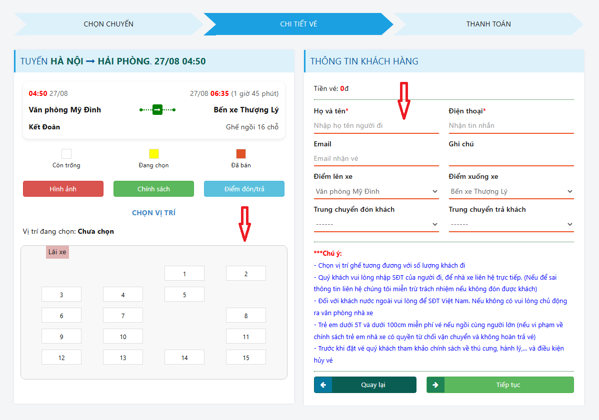 Kiểm tra giờ xuất phát và điểm đón/trả, nhấn “Chọn mua”, sau đó chọn ghế trống và nhập thông tin cá nhân để hoàn tất đặt vé đi Hải Phòng.