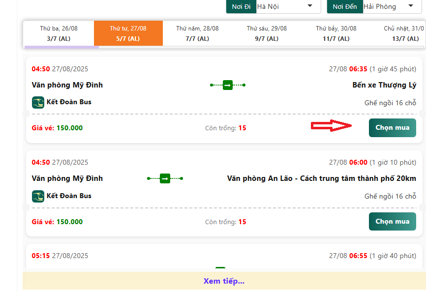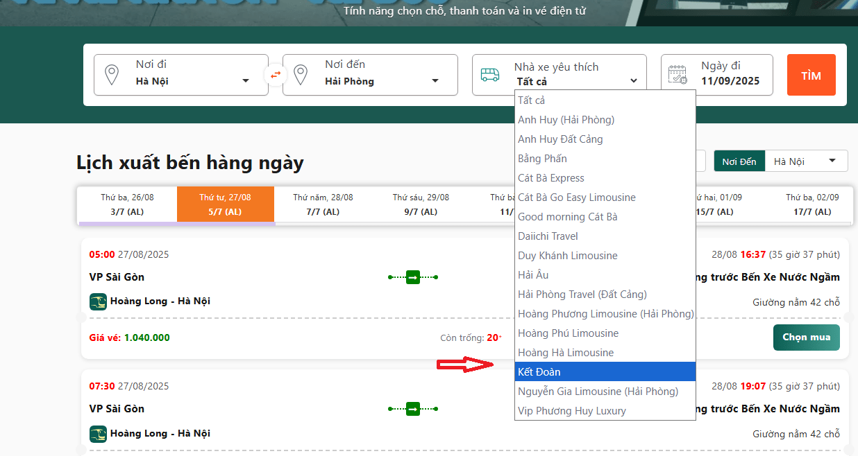 Bước 1: Đặt vé xe khách Kết Đoàn Bus đi Hải Phòng tại: https://vexekhachvn.com/xe-ket-doan-bus/ chọn chuyến đi có thời gian khởi hành và điểm đón/trả phù hợp click “chọn mua”.