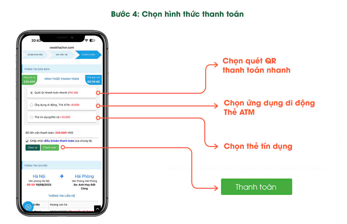 Bước 3: Chọn phương thức thanh toán (quét mã QR, ví điện tử hoặc thẻ tín dụng). Sau khi thanh toán thành công, hệ thống sẽ gửi xác nhận đặt vé và biên lai qua Zalo hoặc tin nhắn SMS.