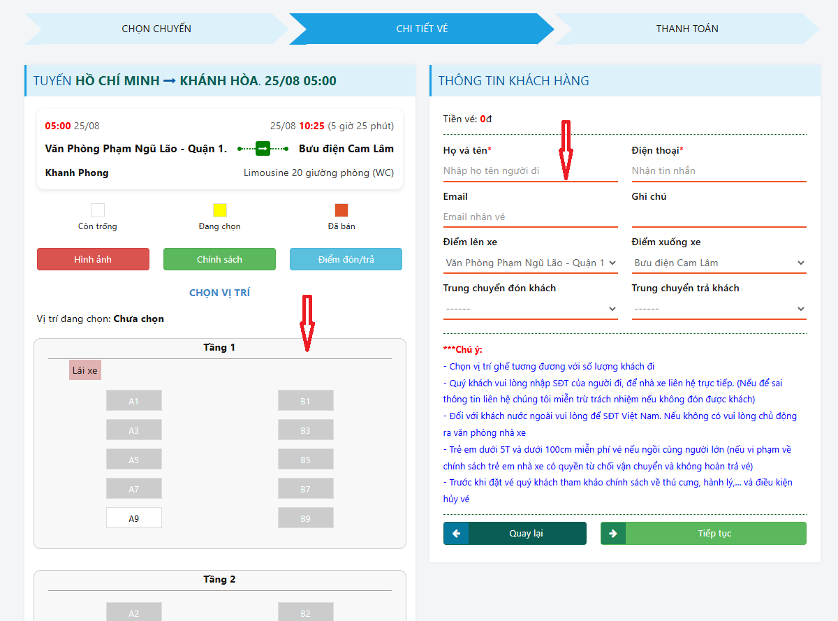 Bước 2: Chọn vị trí ghế ngồi trên sơ đồ. Lưu ý: ghế màu xám là ghế đã có người đặt. Sau đó điền đầy đủ thông tin cá nhân: họ tên, số điện thoại, email, điểm đón/trả và điểm trung chuyển (nếu có).