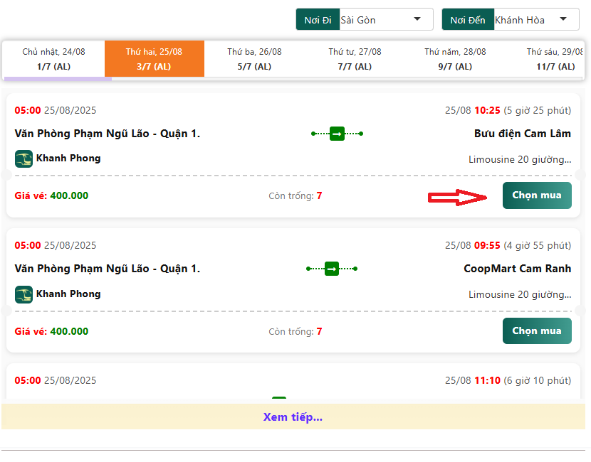 Bước 1: Đặt vé xe khách Xe Khanh Phong đi Khánh Hoà tại: https://vexekhachvn.com/xe-khanh-phong/ chọn chuyến đi có thời gian khởi hành và điểm đón/trả phù hợp.