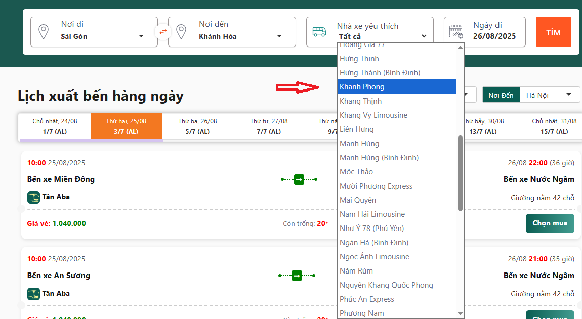 Đặt xe khách liên tỉnh Sài Gòn đi Khánh Hoà tại: vexekhachvn.com và chọn: Nơi đi (Sài Gòn) → nơi đến (Khánh Hoà) → lọc nhà xe Xe Khanh Phong theo hướng dẫn từ ảnh bên dưới.