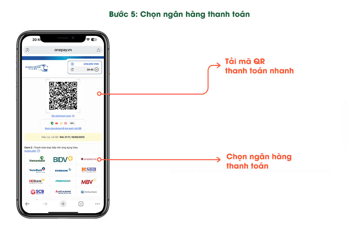 Hành khách tiến hành quét mã QR, chọn ngân hàng hoặc hình thức thanh toán ưa thích, sau đó xác nhận để hoàn tất việc thanh toán.