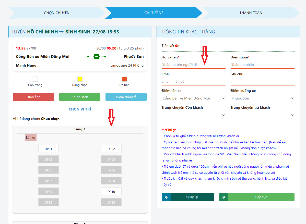 Bước 2: Trên sơ đồ ghế, chọn vị trí mà bạn muốn ngồi. Lưu ý: những ghế màu xám đã được đặt trước. Tiếp theo, nhập đầy đủ thông tin cá nhân bao gồm: họ và tên, số điện thoại, email, điểm đón, điểm trả và điểm trung chuyển (nếu có).