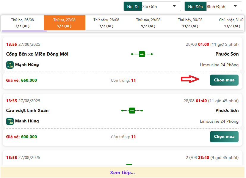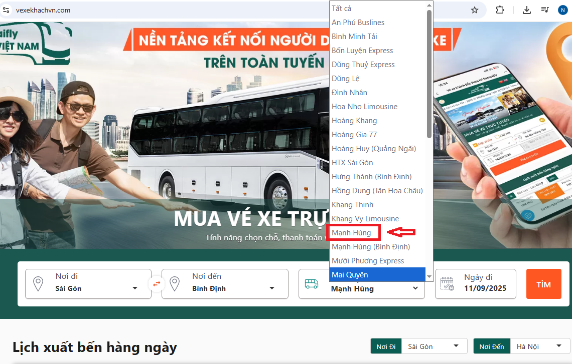 Bước 1: Đặt vé xe khách Xe Mạnh Hùng đi Bình Định tại: https://vexekhachvn.com/xe-manh-hung/ chọn chuyến đi có thời gian khởi hành và điểm đón/trả phù hợp.