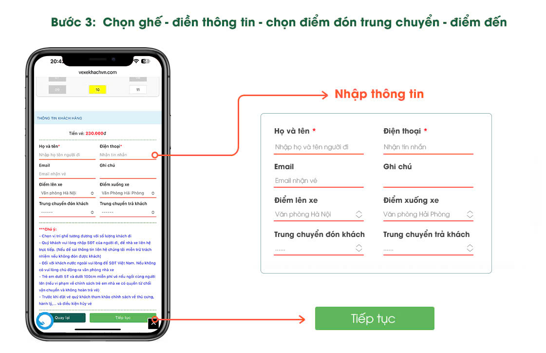 Bước 3: Chọn ghế - điền thông tin - chọn điểm đón trung chuyển - điểm đến