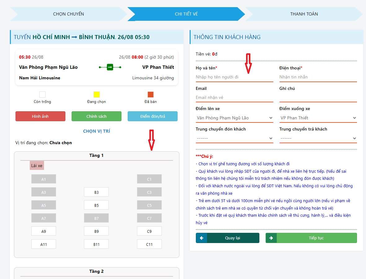 Trên sơ đồ ghế, chọn vị trí còn trống mà bạn muốn. Sau đó, điền đầy đủ thông tin hành khách, bao gồm: họ tên, số điện thoại, email, điểm đón, điểm trả và điểm trung chuyển (nếu có).