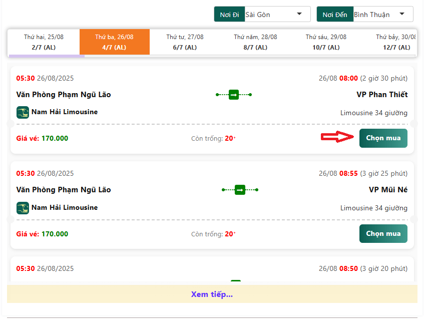 Trong danh sách chuyến xe, kiểm tra giờ khởi hành và điểm đón/trả, sau đó nhấn “Chọn mua” để tiến hành đặt vé.
