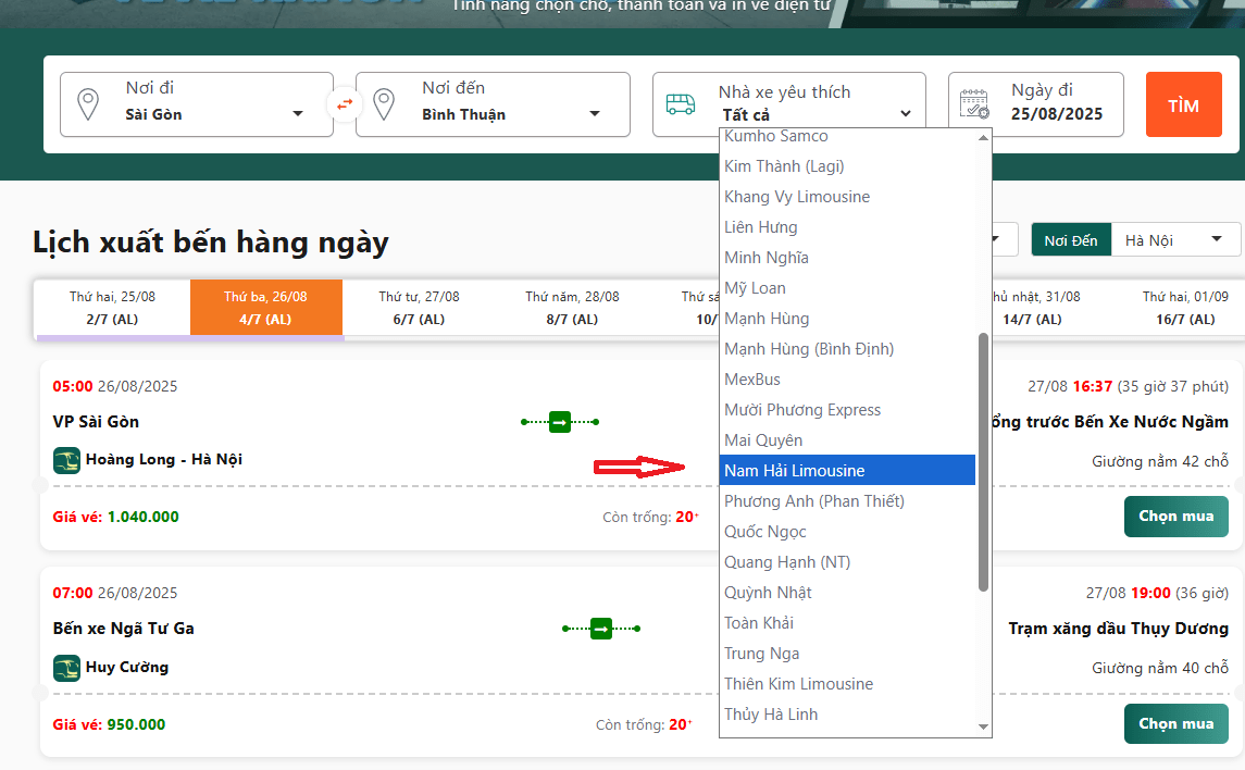 Bước 1: Đặt vé xe khách Nam Hải Limousine đi Bình Thuận tại: https://vexekhachvn.com/xe-minh-nghia/ chọn chuyến đi có thời gian khởi hành và điểm đón/trả phù hợp.