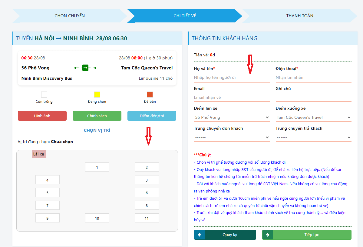 Bước 3: Chọn ghế - điền thông tin - chọn điểm đón trung chuyển - điểm đến