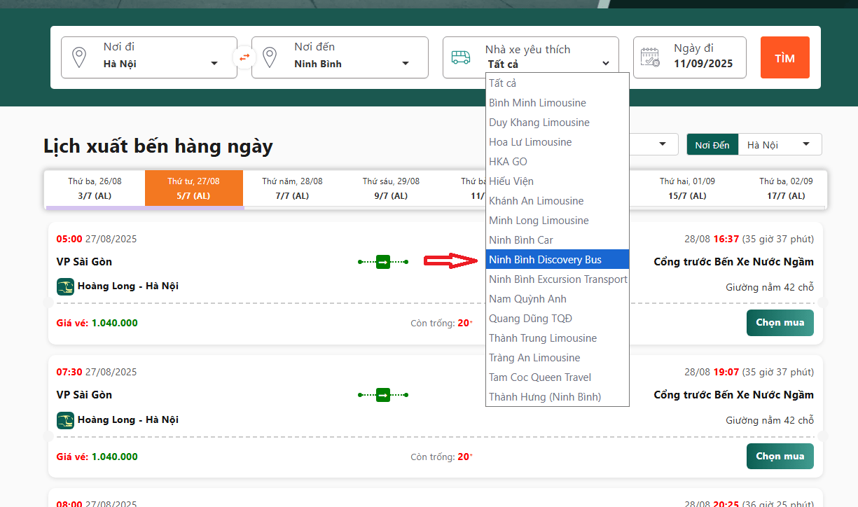Bước 1: Đặt vé xe khách Ninh Bình Discovery Bus đi tại: https://vexekhachvn.com/xe-ninh-binh-discovery-bus/ chọn chuyến đi và nhấn “chọn mua”.