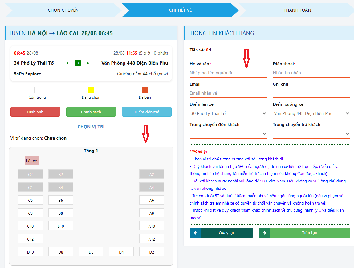 Chọn ghế theo sơ đồ xe, sau đó nhập đầy đủ thông tin hành khách gồm họ tên, số điện thoại, email, điểm đón, điểm trả và điểm trung chuyển (nếu có). Nhấn ‘Tiếp tục’ để tiến hành các bước đặt vé tiếp theo.