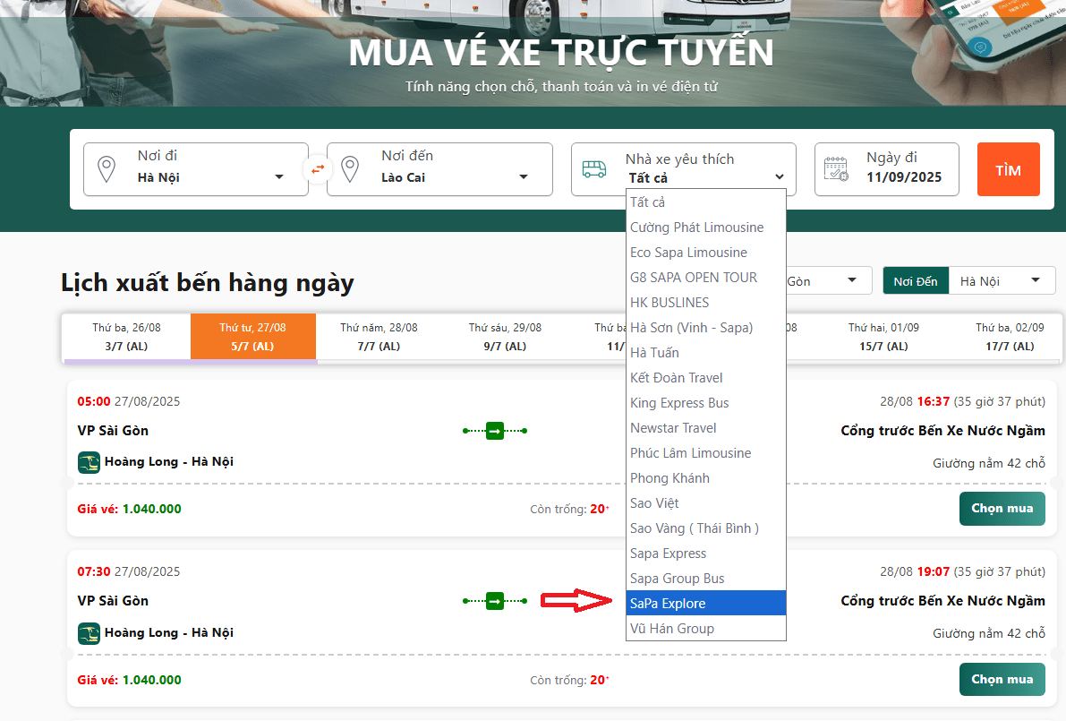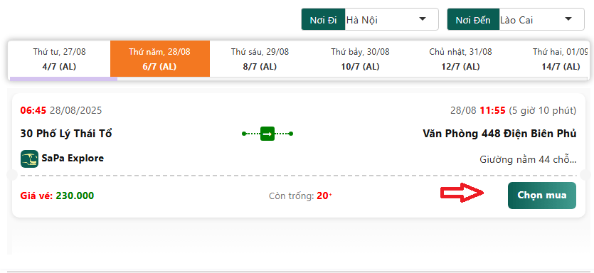 Bước 1: Đặt vé xe khách Sapa Explore đi Lào Cai tại: https://vexekhachvn.com/xe-sapa-explore/ chọn chuyến đi có thời gian khởi hành và điểm đón/trả phù hợp click “chọn mua”.