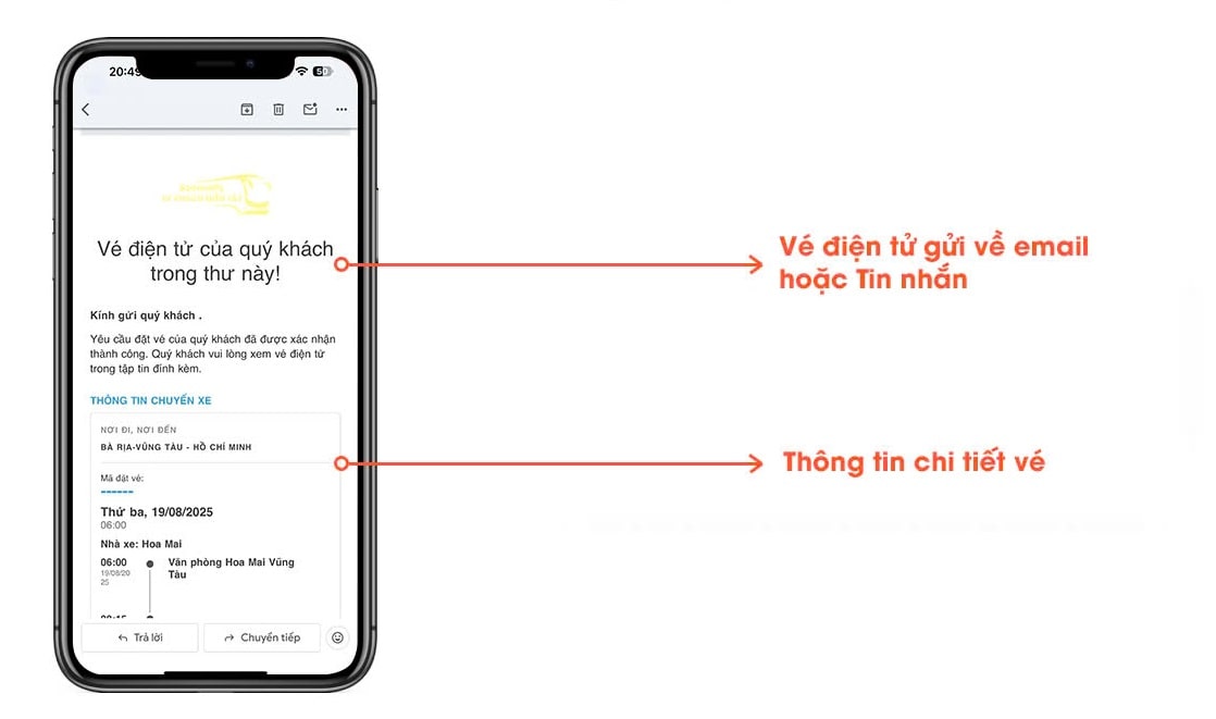 Khi thanh toán hoàn tất, vé điện tử sẽ được gửi đến email hoặc SMS của bạn. Hãy kiểm tra kỹ thông tin trên vé, bao gồm chuyến đi, giờ khởi hành, điểm đón - trả và số ghế, để đảm bảo chính xác trước khi lên xe.