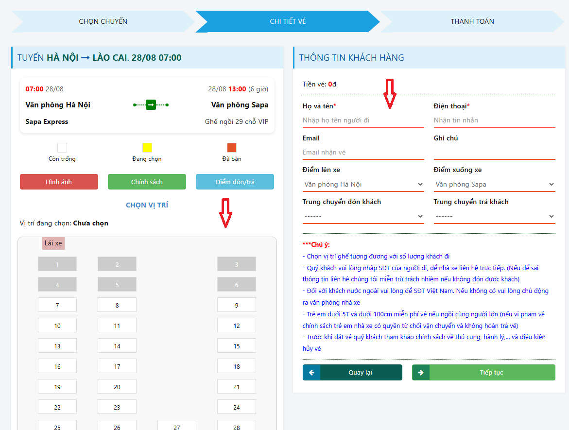 Chọn ghế theo ý muốn trên sơ đồ xe, sau đó điền đầy đủ thông tin hành khách: họ tên, số điện thoại, email, điểm đón, điểm trả và điểm trung chuyển (nếu có). Bấm “Tiếp tục” để thực hiện các bước đặt vé tiếp theo.